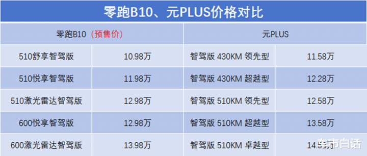 最初是价钱,零跑B10现在的预售价区间是10.98-13.98万,全系提供510km、600km续航的车型;2025款的元PLUS教唆价区间是11.58-14.58万,全系提供430km、510km续航的车型。